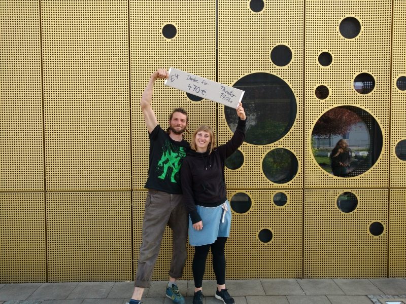 Ganze 470 € sind bei dem Verkauf zusammen gekommen. Den Erlös haben wir der Theaterpädagogin Pauline Buff vom „Theater Pfütze“ überreichen dürfen. Die Spenden fließen direkt in den Jugendclub-“komm!unication”, den integrativen Theaterkurs der “Pfütze” in Nürnberg. Nürnberger Jugendliche und geflüchtete Jugendliche spielen gemeinsam unter Anleitung der Pfütze-Pädagoginnen Theater. Unter www.theater-pfuetze.de könnt ihr gern selbst einen Blick hinter die Kulissen wagen und euch vielleicht selber engagieren?