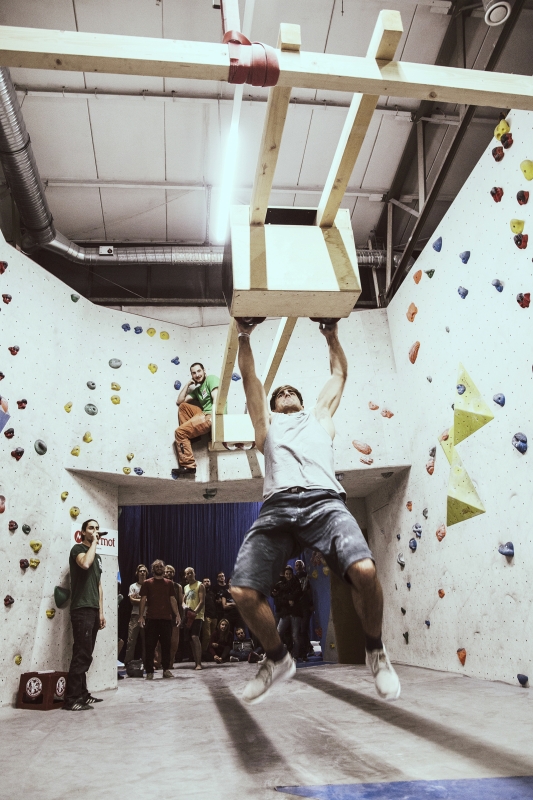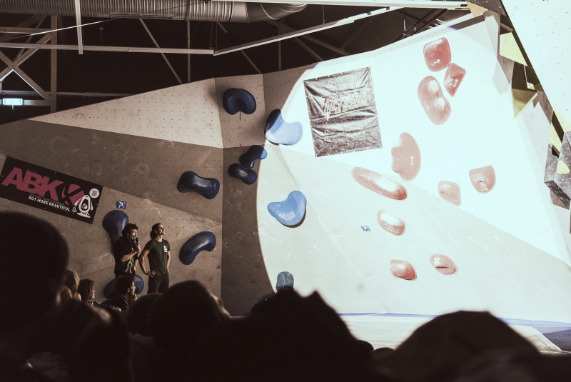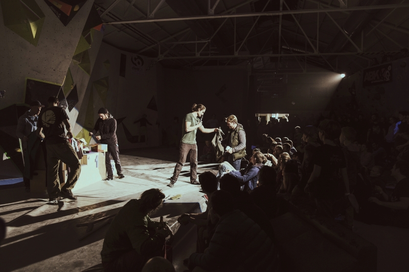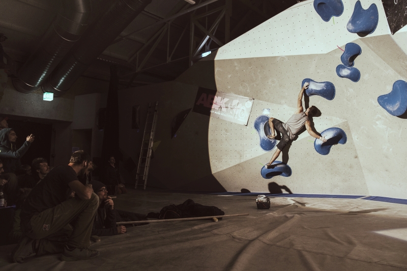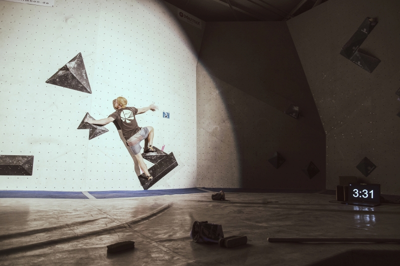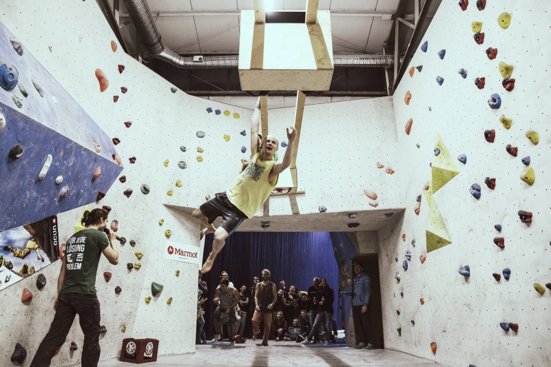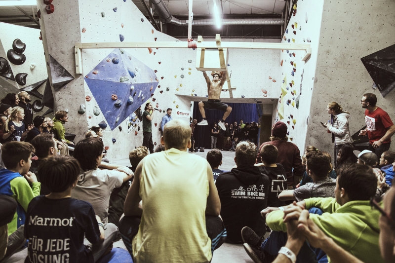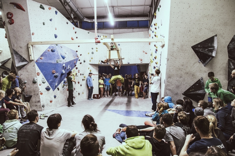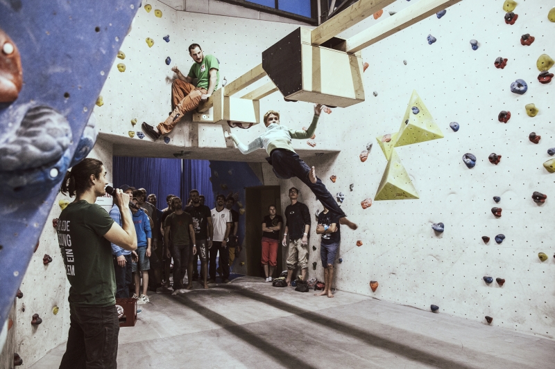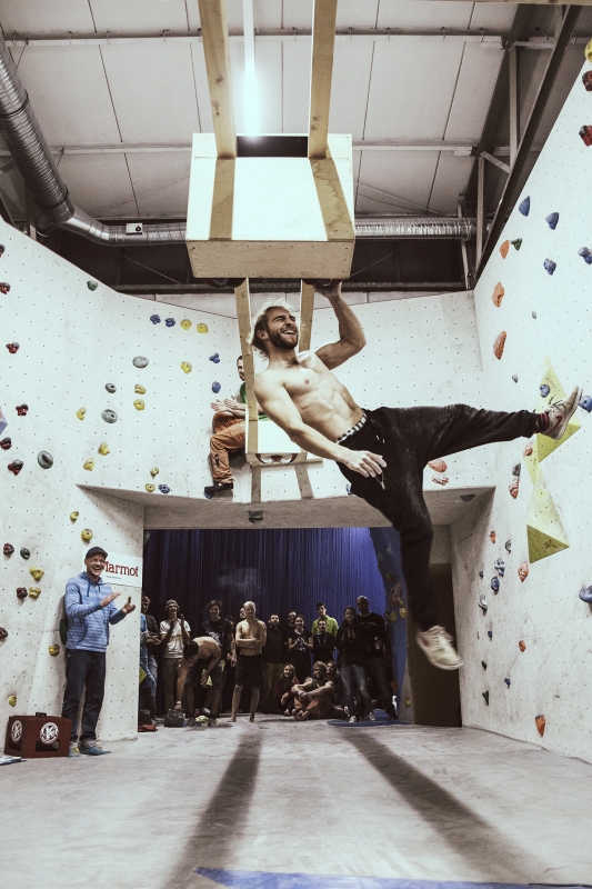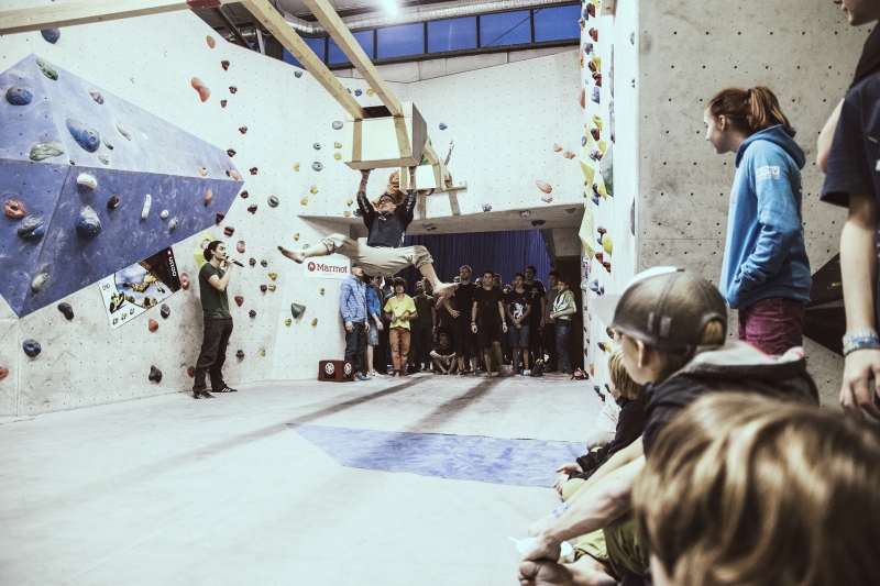 Doch bevor sich die Finalteilnehmer einen großartigen Schlagabtausch lieferten, galt es sich im Weitsprung Contest zu messen. Diese Konstruktion kam erstmalig beim Frankenjura Festival zum Einsatz, bei der Alex Megos damals eine Weite von 3,20Meter bezwang. Gestartet wurde bei einer Weite von 1,60m. Das sich scheinbar wahre Spezialisten dieser Randsportart im Teilnehmerfeld befanden, zeigt die Siegerweite von 3,40 Meter, welche unter frenetischen Anfeuerungen des Publikums erreicht wurde.